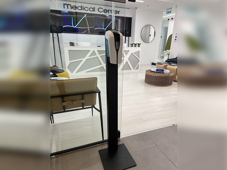 zwarte luxe desinfectiezuil incl spray dispenser met sensor koortsscanners com