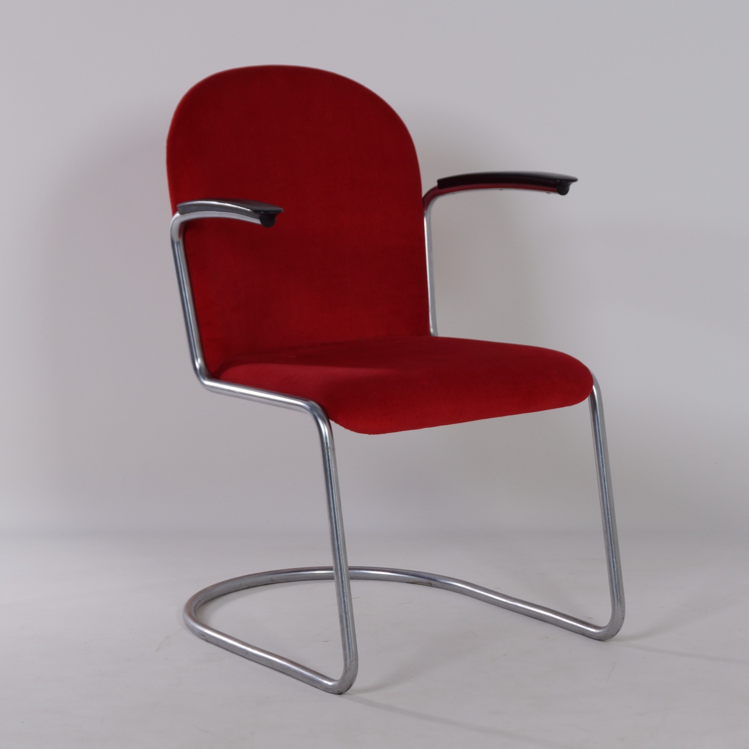 413 r gispen stoel met nieuwe rode manchester rib 1950s