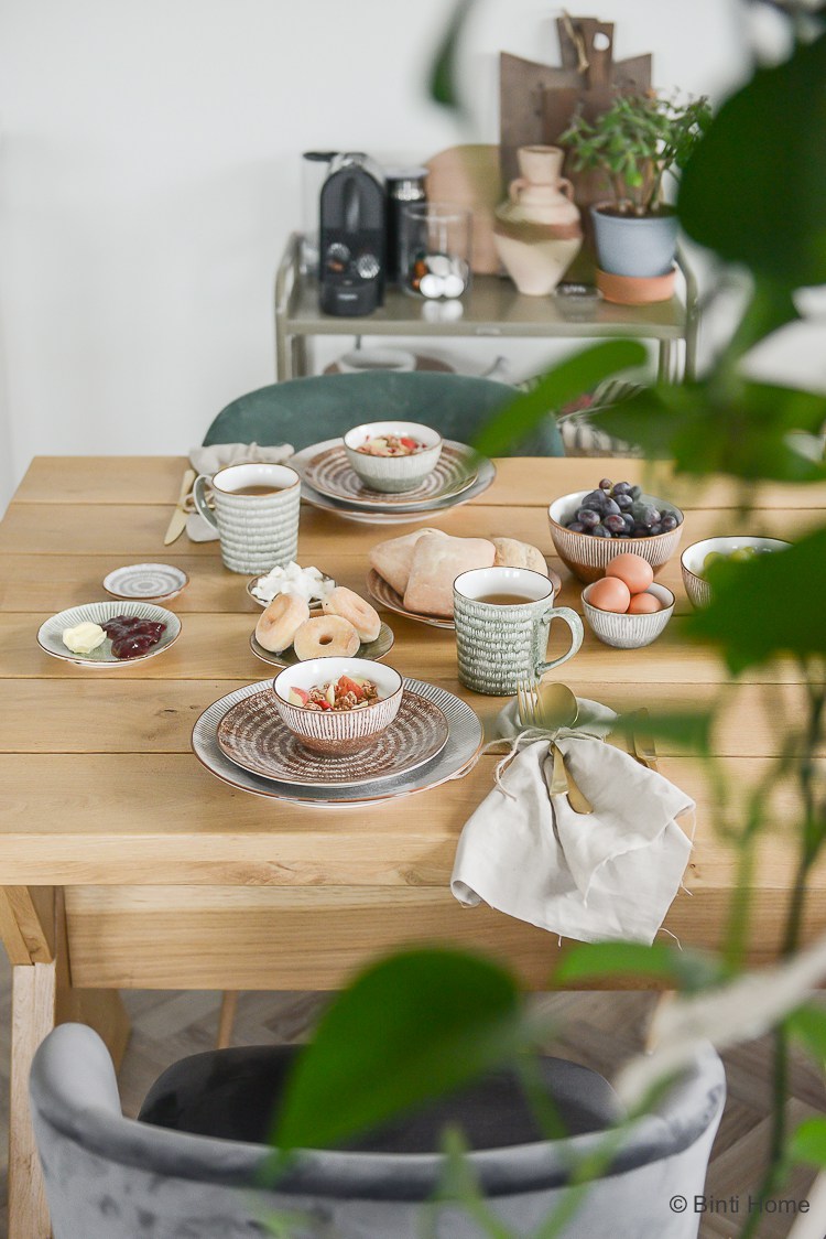 een mooi gedekte tafel het geheel nieuwe blomus aardewerk servies mio bestaat uit borden kommen koppen en kannen in grijze groene interieur servies tafel