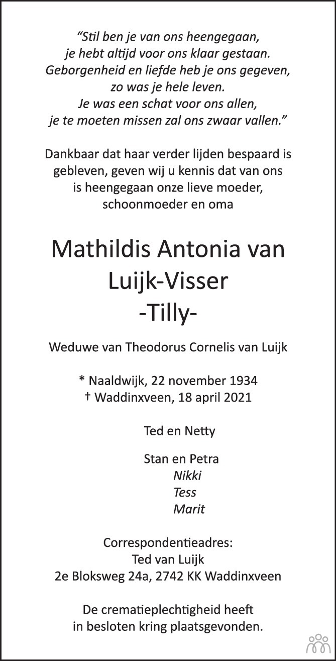 mathildis antonia tilly van luijk visser 18 04 2021 overlijdensbericht en condoleances mensenlinq nl